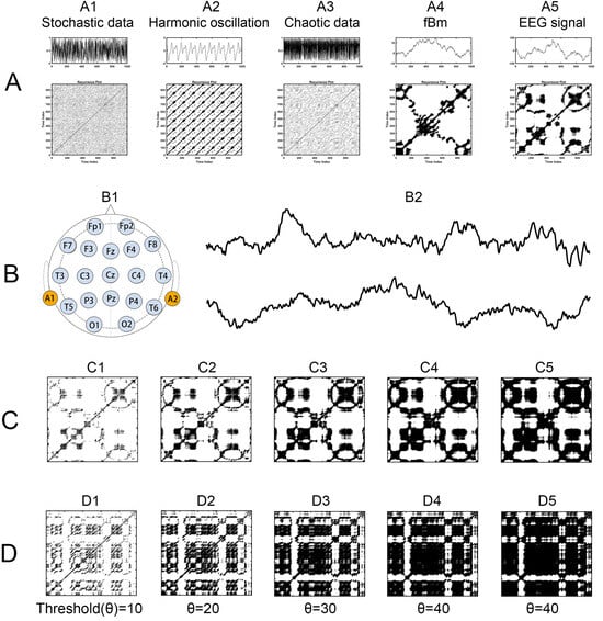 Recurrence Plots for Various Time Series. (A) Time series, each followed by its corresponding recurrence plot, including A1 stochastic data, A2 harmonic oscillation, A3 chaotic data, A4 fractional Brownian motion, and A5 EEG signal. (B) EEG recording, with B1 showing the distribution of electrodes on the EEG scalp, along with B2 illustrating two EEG time series samples: one from a healthy participant and another from a patient with Alzheimer’s Disease. (C,D) Recurrence plots with five different thresholds, derived from the EEG time series of a healthy participant and an Alzheimer’s Disease patient, respectively.