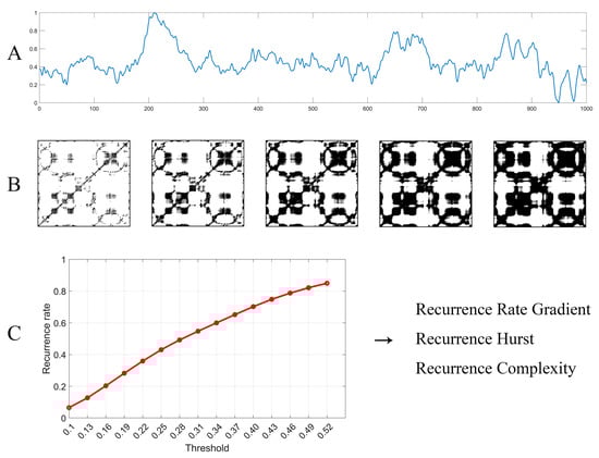 Flow diagram of MTRRP and its derived metrics. (A) EEG time series, which was normalized to ranges from 0 to 1. (B) The recurrence plot of the time series with six different thresholds. (C) The MTRRP, where each point stands for the recurrence rate under a specific threshold, where the recurrence rate can be obtained through the recurrence plot, as illustrated in (B) above. Finally, metrics based on MTRRP can be obtained immediately, including the Recurrence Rate Gradient, Recurrence Hurst, and Recurrence Complexity.