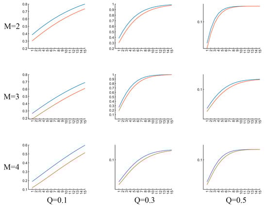 Illustration of MTRRP with different parameters. The blue line and red line are MTRRPs for a piece of EEG signals from AD and healty controls, repsectively. M refers to the embedding dimension for phase space construction, Q the factor proportional to the standard deviation of the dataset.