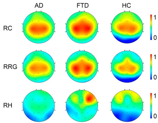 Topography of Recurrence Complexity (RC), Recurrence Rate Gradient (RRG), Recurrence Hurst (RH) in AD, FTD, and healthy controls (HC) with full-band EEG data. For visualization, the metrics were normalized to a range from 0 to 1.