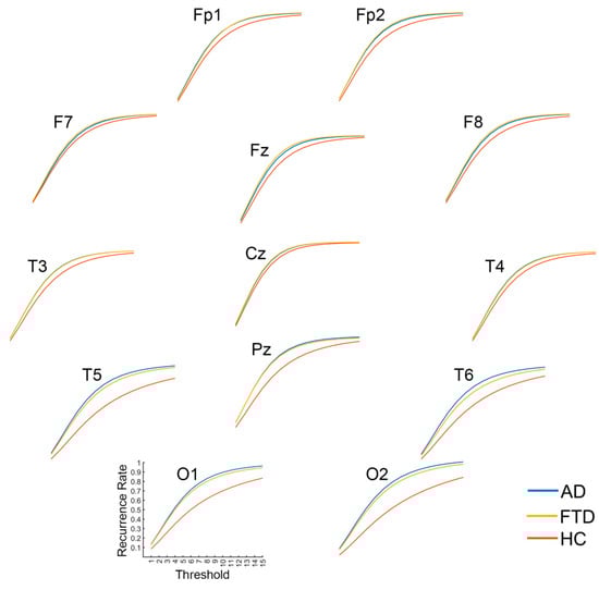 In conclusion, our study proposes the Multi-Threshold Recurrence Rate Plot (MTRRP), and we applied this innovative methodology for EEG analysis in Alzheimer’s Disease (AD) and Frontotemporal Dementia (FTD). Utilizing metrics like Recurrence Complexity, which integrates Recurrence Rate Gradient and Recurrence Hurst, this approach highlights significant alterations in the EEG dynamics of the occipital regions in AD and FTD, particularly within the Alpha and Beta frequency bands. The application of MTRRP resulted in a classification accuracy of 87.7%, demonstrating its potential as a diagnostic tool. This methodology not only advances EEG analysis by bridging recurrence plot and fractal analysis but also opens new avenues for understanding the complex dynamics of neurodegenerative diseases. Future research should expand the sample size and integrate MTRRP with other diagnostic methods to enhance its effectiveness and applicability in clinical settings.