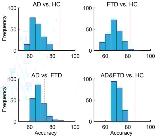 To access the statistical significance of the classification results, a permutation test was performed by randomly shuffling the group labels of the samples. Specifically, each time, we shuffled the labels and trained a new SVM classification model based on the new data, thus obtaining and recording the performance of the classifier. The strategies and specifics of training–testing in the permutation test section were performed identically to the experiment using the real group labels, as reported above (e.g., in each shuffling, features were ranked by correlation coefficient with the shuffled labels, and the top 50 correlated features were selected as input features). This process was repeated 200 times to obtain a null distribution for each classification task. As presented in Figure 9, the permutation test result showed a significantly lower classifier performance in HC vs. AD (p < 0.001), HC vs. FTD (p = 0.015), and HC vs. AD and FTD (p < 0.001), but not in AD vs. FTD (p = 0.19), compared to the classification performance using real labels (see Figure 3 and Table 2).