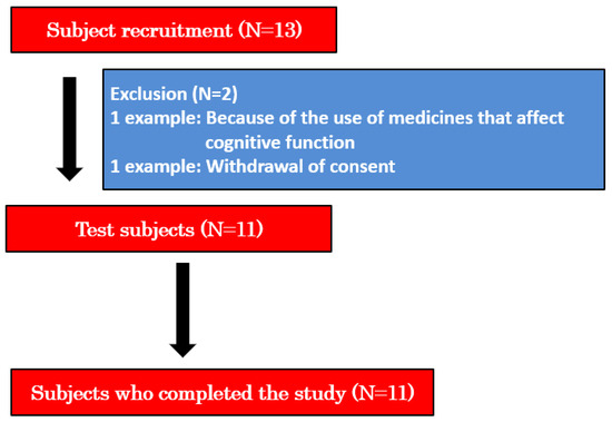Figure 1 presents an overview of this study. The contents of the study were explained to 13 potential test participants, and their consent to participate in the study was obtained. Subsequently, one participant was excluded from the study because he was taking medication that affected cognitive function, and another participant withdrew consent. Consequently, we decided to conduct the study on 11 participants aged 65–86 years who had HDS-R scores of 15–23 and provided written informed consent.