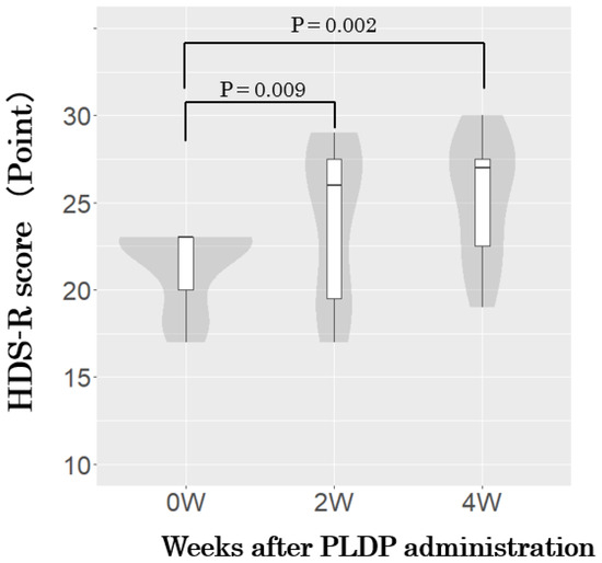 Changes in HDS-R scores after PLDP administration in participants (HDS-R: 15–23 points). Box-and-whisker and violin plots precisely represent the distribution and density of the HDS-R scores. p values indicate t-test results for scores before PLDP administration.