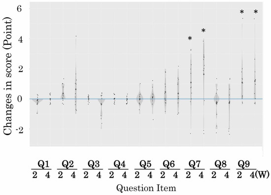 Changes in each item of HDS-R in participants (HDS-R: 15–23 points) 2 and 4 weeks after PLDP administration. Q1: Age; Q2: Orientation to dates; Q3: Orientation to place; Q4: Verbal memory; Q5: Attention; Q6: Recent memory; Q7: Delayed recall of verbal memory; Q8: Visual memory; Q9: Verbal fluency tasks. * p < 0.05, The p value is as follows. Q7 2 W is p = 0.0379, 4 W is p = 0.0251, Q9 2 W is p = 0.0379, 4 W is p = 0.0344.