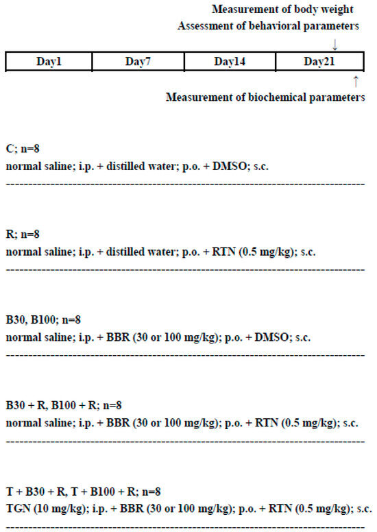 The experimental rats were randomly divided into groups (n = 8 each, with a balanced representation of both sexes) as detailed in Table 1. Prior to injection of RTN or DMSO, administration of BBR or distilled water took place 60 min beforehand. TGN or normal saline injection preceded BBR administration by 30 min. On the 21st day, 8 h post-RTN or DMSO injection, all animals underwent behavioral assessment. The experimental layout is illustrated in Figure 1. To minimize subjective bias, each animal was assigned an arbitrary identification number. Behavioral assessments were conducted independently by two experienced coworkers who were unaware of the treatment regimen for each animal. Each experimenter conducted tests and evaluations separately. Animals were euthanized approximately 1 h after the behavioral assessments. During the study, nine rats succumbed to natural causes for reasons unknown.