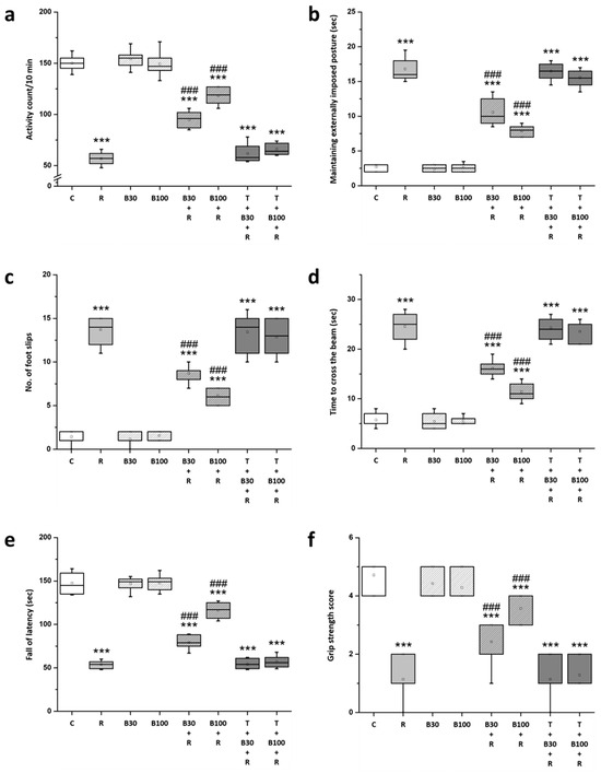 BBR prevented most RTN-induced motor impairment in the rats: (a) locomotor activity, (b) latency to remove from the bar (cataleptic behavior), (c) number of slips, (d) time taken to cross the beam (motor coordination), (e) latency to fall (motor coordination and grip performance), (f) grip strength score (neuromuscular strength). Data are presented as mean ± SEM (n = 8). One-way ANOVA with Tukey’s test: *** p < 0.001 as compared with C; ### p < 0.001 as compared with R. (C: control group; R: RTN 0.5 mg/kg treatment group; B30: 30 mg/kg BBR without RTN treatment group; B100: 100 mg/kg BBR without RTN treatment group; B30 + R: BBR 30 mg/kg + RTN treatment group; B100 + R: BBR 100 mg/kg + RTN treatment group; T + B30 + R: TGN 10 mg/kg + BBR 30 mg/kg + RTN treatment group; and T + B100 + R: TGN + BBR 100 mg/kg + RTN treatment group).