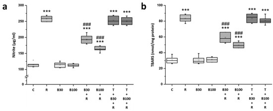 BBR reduced RTN-induced striatal nitrosative and oxidative stress in the rats: (a) nitrite and (b) TBARS. Data are presented as mean ± SEM (n = 8). One-way ANOVA with Tukey’s test: *** p < 0.001 as compared with C; ### p < 0.001 as compared with R. (C: control group; R: RTN 0.5 mg/kg treatment group; B30: 30 mg/kg BBR without RTN treatment group; B100: 100 mg/kg BBR without RTN treatment group; B30 + R: BBR 30 mg/kg + RTN treatment group; B100 + R: BBR 100 mg/kg + RTN treatment group; T + B30 + R: TGN 10 mg/kg + BBR 30 mg/kg + RTN treatment group; and T + B100 + R: TGN + BBR 100 mg/kg + RTN treatment group).