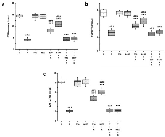BBR prevented RTN-induced decreased striatal antioxidation power in the rats: (a) GSH, (b) SOD, and (c) CAT. Data are presented as mean ± SEM (n = 8). One-way ANOVA with Tukey’s test: *** p < 0.001 as compared with C; ### p < 0.001 as compared with R. (C: control group; R: RTN 0.5 mg/kg treatment group; B30: 30 mg/kg BBR without RTN treatment group; B100: 100 mg/kg BBR without RTN treatment group; B30 + R: BBR 30 mg/kg + RTN treatment group; B100 + R: BBR 100 mg/kg + RTN treatment group; T + B30 + R: TGN 10 mg/kg + BBR 30 mg/kg + RTN treatment group; and T + B100 + R: TGN + BBR 100 mg/kg + RTN treatment group).