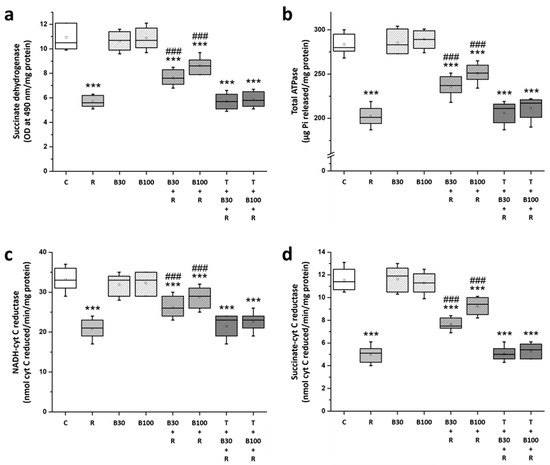 BBR prevented RTN-induced striatal mitochondrial dysfunction in the rats: (a) SDH, (b) total ATPase, (c) NADH-cytochrome C reductase (complex I-III), and (d) succinate-cytochrome C reductase (complex II-III). Data are presented as mean ± SEM (n = 8). One-way ANOVA with Tukey’s test: *** p < 0.001 as compared with C; ### p < 0.001 as compared with R. (C: control group; R: RTN 0.5 mg/kg treatment group; B30: 30 mg/kg BBR without RTN treatment group; B100: 100 mg/kg BBR without RTN treatment group; B30 + R: BBR 30 mg/kg + RTN treatment group; B100 + R: BBR 100 mg/kg + RTN treatment group; T + B30 + R: TGN 10 mg/kg + BBR 30 mg/kg + RTN treatment group; and T + B100 + R: TGN + BBR 100 mg/kg + RTN treatment group).
