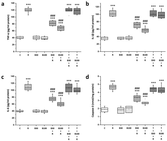 BBR blocked RTN-induced increased striatal neuroinflammatory and apoptotic markers in the rats: (a) TNF-α, (b) IL-1β, (c) IL-6 and (d) caspase-3. Data are presented as mean ± SEM (n = 8). One-way ANOVA with Tukey’s test: *** p < 0.001 as compared with C; ### p < 0.001 as compared with R. (C: control group; R: RTN 0.5 mg/kg treatment group; B30: 30 mg/kg BBR without RTN treatment group; B100: 100 mg/kg BBR without RTN treatment group; B30 + R: BBR 30 mg/kg + RTN treatment group; B100 + R: BBR 100 mg/kg + RTN treatment group; T + B30 + R: TGN 10 mg/kg + BBR 30 mg/kg + RTN treatment group; and T + B100 + R: TGN + BBR 100 mg/kg + RTN treatment group).