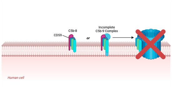 Simplified illustration of CD59 inhibiting formation of the membrane attack complex. CD59 molecules expressed by human cells bind to C5b-8 or incomplete C5b-9 complexes and block the incorporation of multiple C9 molecules, preventing the formation of functional MACs. The illustration was adapted from “Formation of the Membrane Attack Complex” by BioRender.com (2024). Retrieved from https://app.biorender.com/biorender-templates, accessed on 8 March 2024.