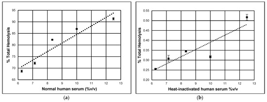 Alternative complement pathway activity in human serum. Dilutions of human serum were applied to rabbit red blood cells. Percentage of total hemolysis measures the cytolytic complement activity. (a) Normal human serum (y = 3.699x + 47.555; R2 = 0.9079). (b) Heat-inactivated human serum (y = 0.0364x + 0.0265; R2 = 0.816). Error bars represent +/− SE. Graphs were constructed using Excel, Microsoft 365 version 2405 (Microsoft).