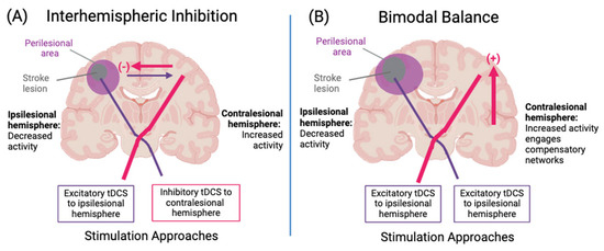 The anatomic targets of tDCS are typically at the level of the cortex, as it is much more difficult to reliably direct current to subcortical or brainstem sites. Additionally, stimulation targets are typically brain regions that are hypothesized directly related to the impairment being targeted. There are two central models that have historically guided how brain regions are selected as targets for stimulation (Figure 2). The first model—the interhemispheric imbalance model—is based on the notion that functional impairments are mediated, at least in part, by a mismatch in brain activity between cerebral hemispheres induced by unilateral injury of the brain. This model is predicated on the notion that many of the connections between the two cerebral hemispheres are inhibitory in nature and that intact cerebral hemispheres, therefore, normally exert an inhibitory influence on each other. According to this account, a unilateral injury to the brain results in (1) decreased cortical excitability on the injured (i.e., ipsilesional) hemisphere, (2) decreased inhibitory projections to the intact (i.e., contralesional) hemisphere, and (3) further inhibition of the ipsilesional hemisphere mediated by increased contralesional interhemispheric inhibition [80]. This implies that two intervention strategies for improving the imbalance between ipsilesional and contralesional hemispheres would be to either increase the excitability of the ipsilesional hemisphere or decrease the activity of the contralesional hemisphere. This version of the interhemispheric imbalance model has motivated a number of studies, employing tDCS and other forms of noninvasive neuromodulation in motor recovery [81,82], neglect [83], and aphasia [83,84,85,86,87].