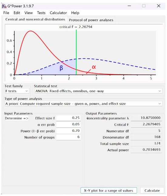 It is observed that the critical F has a value of 2.267 at an approximate power of 0.70, which corresponds to a type II error of 0.3 and is minimally accepted [58,59,60], and a minimum sample size of 174 for the 6 groups entered. The volume of the sample included in the research is 177. The graph in the upper part of Figure 1 illustrates the ratio between the H0 and H1 distributions, projects the intersection of alpha and beta type errors, and indicates a limited possibility of rejecting the null hypothesis.