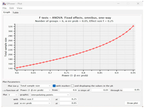 Before starting the statistical procedures for verifying the formulated hypotheses, it is necessary to carry out some procedures regarding the power of the test and the size of the effect. Power analysis integrates a set of procedures aimed at identifying fundamental parameters regarding the scientific relevance of particular methodological approaches such as: effect size, alpha, type II error, sample size, variability of distributions and, of course, power [56,57]. The power analysis was performed with the program G*Power 3, offered free-of-charge to users (open-source) by the Institute of Experimental Psychology at the Heinrich Heine University in Dusseldorf, version 3.1.9.7.