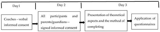 Observational research with a cross-sectional strategy was carried out between May and July 2023, Figure 3. The two questionnaires were applied physically, in a technical session with the agreement of the coaches (day 1) and athletes (day 2). During the technical sessions, the athletes were presented with the most relevant theoretical aspects regarding the concept of attention, the typology of the attention style, the qualities of attention, and relevant aspects regarding attention in indoor sports games (day 3). After the theoretical information sessions, the two questionnaires were applied to the athletes (day 3), with preliminary information before starting the questionnaires.