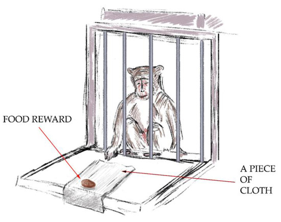 - The “Tool Use: Pulling Cloth with Treat” test (Figure 2). For the second test, the primates had to get the treat by pulling a piece of cloth. A piece of cloth (30 cm × 15 cm) with a treat on its end was posed so that the primate could reach the cloth, but the treat was rather far away from the monkey, such that it could not grab the treat with its paw. The primate had to use the tool to get the treat with it. The aim of the test was to demonstrate the ability to manipulate objects outside the cage and understand the spatial relationship between objects. A successful outcome scored 2 points.