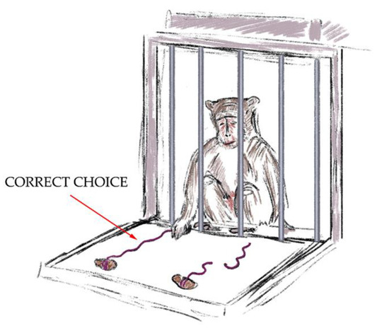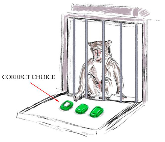 - The “Sticker Cup” test (Figure 4). There were three overturned cups put in a row on the platform in front of the testing cage. One of the cups had a white sticker on it. The experimenter showed the primate under which cup he put the treat and marked it with a white sticker. The aim of the experiment was to choose the right cup. A second choice was not given to the primate if it could not choose the right cup the first time. The experiment was successful when the primate chose the cup with the white sticker on the initial try. During the training sessions, it was crucial to solidify the primate’s connection between the sticker and the treat. A successful outcome was awarded 1 point.