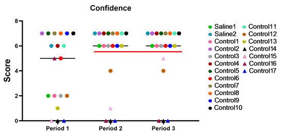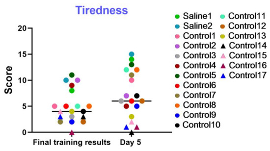This examination was utilized to dynamically evaluate the level of fatigue, the general psychophysiological condition, and the motivation of the test primates during training sessions and on day 5 of the experiment. The results displayed in the graph (Figure 14) indicate that most primates successfully coped with the tasks and improved their performance over time. The primates who initially had difficulties in the Confidence test and scored low, or even refused to work with the experimenters, scored the lowest in this test (not more than 4 points). Negative dynamics were shown by primates C13, C14, C15, C16, and C17. Primates C3, C7, C9, C10, and C12 scored low in the final training results but increased their scores over time. Additionally, the results of the “Tiredness” test show that two primates who were subjected to medical manipulations improved their performance and coped well with the tasks presented. Thus, it can be concluded that medical manipulations do not affect the performance capacity and tiredness of primates.