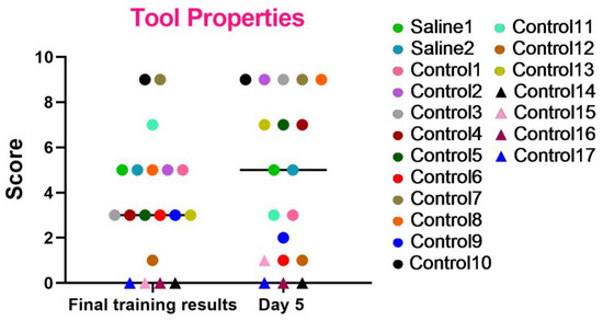 The outcomes of the “Tool Use and Properties” test in relation to time during the final day of the training and on day 5 after the manipulations. Saline had not yet been administered to the Saline 1 and Saline 2 primates during the training period; homonymy was retained throughout for ease of reference. The primates without manipulations were labeled Control 1–17.