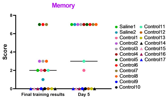 These tests focused on evaluating the memory status and cognitive processes of manipulating, associating, and storing acquired information of the primates under study. The results displayed in the graph (Figure 9) indicate that the majority of the primates successfully coped with the tasks and improved their performance over time. The primates that initially had difficulties with the Confidence test and scored low (C12, C14, C15, C16, and C17) or outright refused to work with experimenters also failed to perform well in this test. Additionally, we saw several other primates that failed the task (C9, C10, and C13), which could be related to stress or the relative difficulty of the test itself, which required maximum engagement, attentional focus, and intelligence from the primates. Moreover, the results in the “Memory” test show that two primates subjected to medical manipulations (blood collection and saline injection) improved their results on day 5 of the study. The control primates, for the most part, also scored higher. Thus, it can be concluded that medical manipulations do not affect the mnemonic functions of primates.