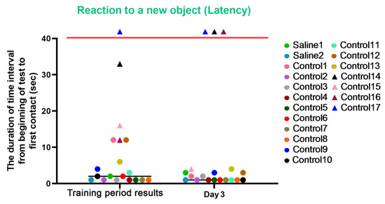 The results of the latency characteristic evaluation in the test “Reaction to a New Object” in terms of dynamics before manipulations (training period results) and on day 3 after manipulations. Primates that were unsuccessful in the test and declined to engage with the experimenters or whose test completion time exceeded 100 s are situated above the red line. Saline had not yet been administered to the Saline 1 and Saline 2 primates during the training period; homonymy was retained throughout for ease of reference. The primates without manipulations were labeled Control 1–17.