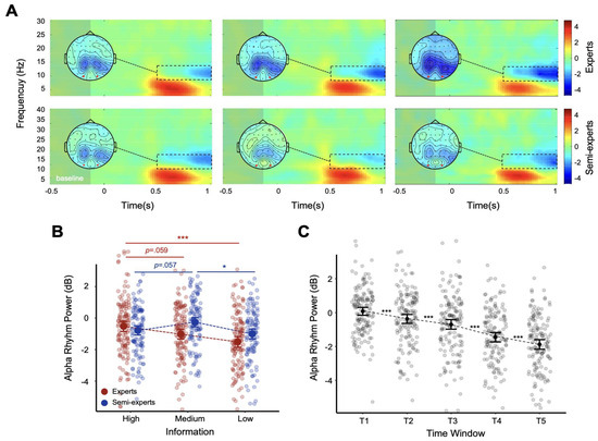 Alpha oscillations. (A) Time−frequency representation and topography plots of alpha oscillations under high—(left), medium—(middle), and low—(right) information conditions. The time–frequency windows for analysis are outlined with dotted lines. The red circles on the topographic map indicate the analyzed channels (O1, Oz, and O2). (B) The Group × Information interaction of the alpha oscillation and (C) alpha oscillations under different time windows (T1–T5). * p < 0.05; ** p < 0.01; *** p < 0.001.
