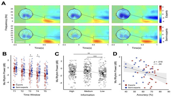 Mu oscillation results. (A) Time–frequency representation and topography plots of mu oscillations under the high—(left), medium—(middle), and low—(right) information conditions. The time–frequency windows for analysis are outlined with dotted lines. The red circles on the topographic map indicate the analyzed channels (C3, Cz, and C4). (B) The change in mu rhythms between experts and amateurs in different time windows, with red indicating experts and blue indicating amateurs. (C) Graph of pairwise comparisons of Information volume. (D) Correlation between T3 and T4 time window mu rhythm activity under the medium-information condition. * p < 0.05; ** p < 0.01; *** p < 0.001.