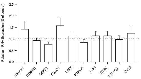 Relative mRNA expression of WNT signaling pathway genes in the dorsolateral prefrontal cortex (DLPFC) tissue of schizophrenia (n = 20) compared to non-psychiatrically ill control (n = 20) subjects, reported as percent of control (geometric mean of reference genes β2M and GAPDH). Data presented as mean ± standard error of the mean (SEM). Abbreviations: IQGAP1, IQ motif containing GTPase activating protein 1; CTNNβ1, Beta-catenin; GSK3β, Glycogen synthase kinase 3 beta; FOXO1, Forkhead box O1; LRP6, Lipoprotein receptor-related protein 6; MGEA5, Meningioma expressed antigen 5; TCF4, Transcription factor 4; βTRC, Beta-transducin repeat containing E3 ubiquitin protein ligase; PPP1Cβ, Protein phosphatase 1 catalytic subunit beta; DVL2, Disheveled segment polarity protein 2.