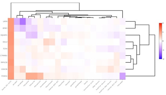 Region-level transcriptomic datasets showed an inconsistent pattern of WNT signaling pathway gene expression between schizophrenia and control groups. Across 20 datasets, βTRC was upregulated in one dataset (LFC = 1.05) and downregulated in three (LFC = −0.13), DVL2 was upregulated in two datasets (LFC = 0.56), FOXO1 was upregulated in four datasets (LFC = 0.72) and downregulated in one (LFC = −0.82), GSK3β was downregulated in one dataset (LFC = −0.05), IQGAP was significantly upregulated in two datasets (LFC = 0.59) and downregulated in one (LFC = −0.53), LPR6 was downregulated in two datasets (LFC = −0.80), PPP1Cβ was upregulated in one dataset (LFC = 1.08), and TCF4 was upregulated in two datasets (LFC = 0.04). These data are summarized in Supplementary Table S3 and displayed in Figure 2.