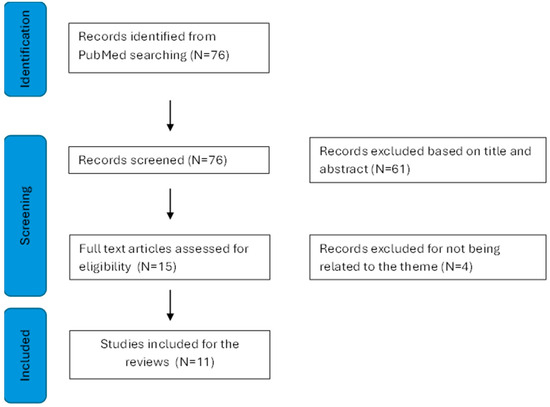 This advanced search yielded a total of 76 articles. After screening titles and abstracts, 15 publications were initially considered. However, upon full-text examination, 4 publications were excluded for not meeting inclusion criteria, leaving 11 articles for the present review (see Figure 1).