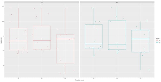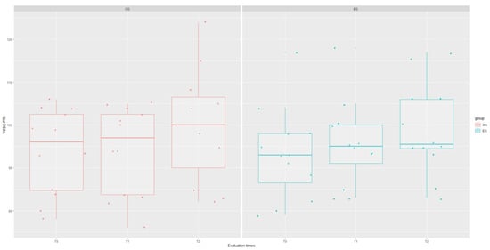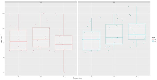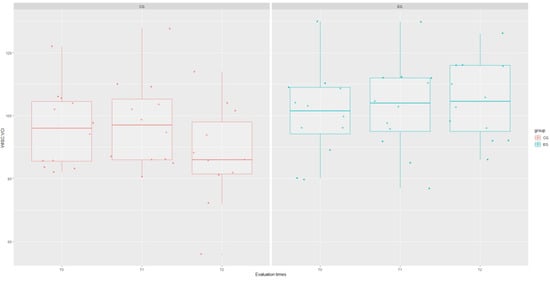 The results of the mixed-effect analysis showed that the type of treatment affected the WISC Verbal Communication Index (VCI) domain (χ2(1) = 4.215; p = 0.040), increasing the scores of this test in the experimental group by about 8.48 ± 43.78 (t = 2.24; p = 0.044), as well as the WISC Global Intelligence Quotient (IQ) domain (χ2(1) = 8.12; p = 0.044), although this significance is influenced by the interaction term “group: time” (t = 2.61; p = 0.012). However, signs of a stronger recovery trend in EG are evident for each WISC domain, as shown in Figure 1, Figure 2, Figure 3, Figure 4 and Figure 5.