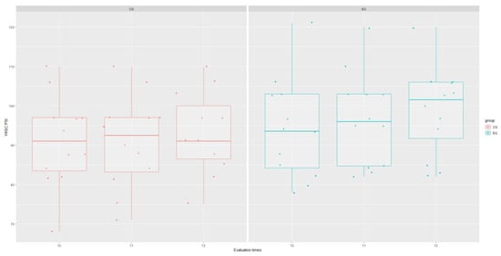 The Friedman test was applied to perform a non-parametric one-way repeated measures to evaluate differences in DDE scores among assessment times (i.e., T0, T1, and T2) for EG and CG each. For a post hoc analysis, we used the Wilcoxon–Nemenyi–McDonald–Thompson test, in which p-values were already corrected for multiple testing.