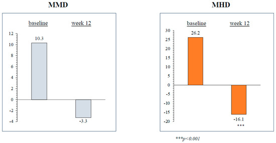 | MHD ** | 26.9 ± 3.8 | 9.4 ± 9.4 | −17.4 ± 10.3 | 0.004 |