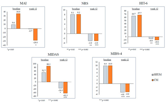 Change in monthly migraine days (MMD), monthly headache days (MHD), monthly analgesic intake (MAI), Numerical Rating Scale (NRS) score, Headache Impact Test-6 (HIT-6) score, Migraine Disability Assessment Scale (MIDAS) score and Migraine Interictal Burden Scale (MIBS-4) score from baseline to weeks 9–12 in the whole migraine population (All patients), in patients with high-frequency episodic migraine (HFEM) and in those with chronic migraine (CM).