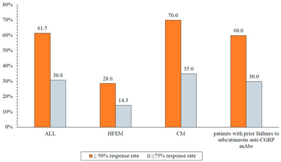 Figure 4). Among the 10 patients who did not previously respond to ≥1 subcutaneous anti-CGRP mAb, 60.0% showed a ≥50% response to eptinezumab, and 30.0% exhibited a ≥75% response (