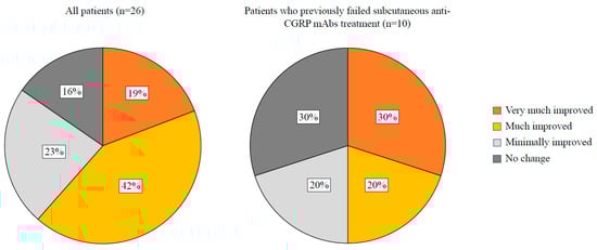 Table 5). The mean PGIC score at week 12 was 2.1 ± 0.8 (HFEM: 2.3 ± 0.7; CM: 2.1 ± 0.8). The clinical change was rated as much or very much improved by 61.0% of the patients and by 50.0% of those who previously failed subcutaneous anti-CGRP mAbs treatment (