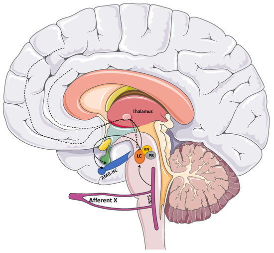 Although the vagus nerve is traditionally known for its efferent parasympathetic pathways to visceral organs (heart, lung, gastrointestinal…), about 80% of the vagus nerve provides afferent conduction to the brain [1,2]. VNS mechanisms for affecting conditions in the brain are not fully elucidated. Several hypotheses exist, including the following: (1) the desynchronization of electroencephalography (EEG) through the tractus solitarius and the medullary reticular formation pathway; and (2) decreased excitatory/increased inhibitory neurotransmission [3,4,5]. VNS’s central effect is generated by the stimulation of afferent unmyelinated type C fibers of the vagus nerve [2,4,5]. The afferent vagus nerve projects to the ipsilateral nucleus tractus solitarius (NTS) and the caudal portion of the contralateral NTS. The NTS relays information to the reticular formation in the medulla, forebrain limbic structures, and forebrain largely through brainstem nuclei, namely the locus coeruleus (LC) and raphe nuclei [2,6], in addition to direct projections to the amygdala and the hypothalamus [2,6,7]. Animal studies have demonstrated LC activation after transient and chronic vagus nerve stimulation [5,8] and the downstream release of norepinephrine at the amygdala, hippocampus, and prefrontal cortex [2,9,10]. The exploitation of vagus nerve physiology remains the prevailing working theory behind VNS safety and efficacy. A recent work has shown a neuroprotective effect by inhibiting pro-inflammatory cytokines and contributing to blood–brain barrier integrity, exerting a systemic and local result on neurological disorders and multiple organs (gut microbiota, cardiovascular) [11]. Other studies have found a VNS-induced theta rhythm with underlying gap junction functional changes in astrocytes, and a potential effect on local excitability at hippocampal slices [12,13,14]; this suggests a possible other mechanism of VNS neuromodulation. Figure 1 illustrates a schematic representation of the anatomical central projections of the vagus nerve.