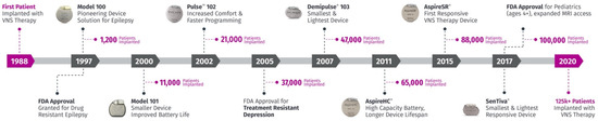 Vagus nerve stimulation (VNS) technology development timeline. Adapted with permission from LivaNova. VNS underwent several iterations to improve safety, tolerability, and therapy delivery. The graph shows different models and the number of patients implanted.