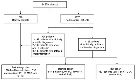 We investigated three independent cohorts of these subjects to develop and assess our proposed radiomics-guided DL model, as previously described [22]. In brief, the pretraining cohort consisted of 220 healthy controls and 398 Parkinsonian patients (241 IPD, 79 MSA, and 78 PSP) with clinically possible diagnoses, or with onset age < 40 years, or without detailed chart information. The pretraining cohort was used for preliminary training for the exclusion of non-Parkinsonian subjects. The training cohort contained 547 Parkinsonian patients (299 IPD, 150 MSA, and 98 PSP) with a clinically definite diagnosis, which was used to fine-tune the preliminary DL model. The test cohort consisted of 330 Parkinsonian patients (211 IPD, 61 MSA, and 58 PSP) with a clinically confirmative diagnosis, which was used to evaluate the prediction performance. A detailed eligibility profile of these subjects is shown in Figure 1.