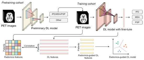 Thus, we aimed to propose a radiomics-guided DL model to discover interpretable DL features from PET images and further verify the proposed model through the differential diagnosis of Parkinsonian syndromes. We hypothesized that the radiomics-guided DL model may capture the complex glucose metabolic changes and abstract semi-supervised features associated with different Parkinsonian syndromes.