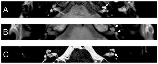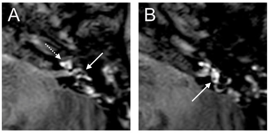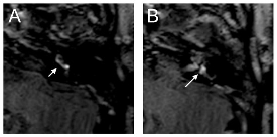 Figure 3A,B). An RWS was not detected in the affected ear. In this MR sequence, we could also observe a SURI on the right side (vestibular endolymphatic hydrops, grade I) (