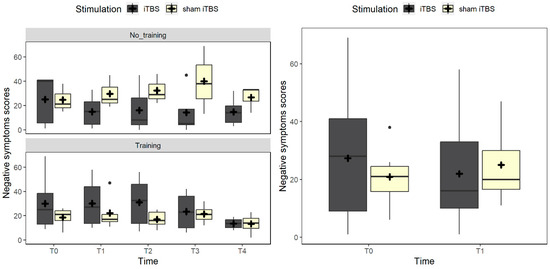 The figure represents the trend of negative symptom scores. On the left panel, the box plots compare real vs. sham iTBS in the no-training and training conditions. The right panel shows the pre–post change in negative symptoms in the real vs. sham iTBS conditions. Black dots represent outliers, and the cross symbol represents the mean values.