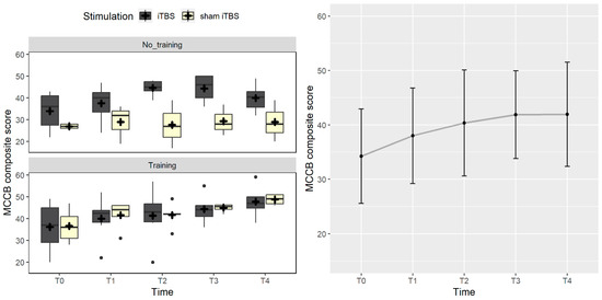 The figure represents the MCCB composite score trend. On the left panel, the box plots compare real vs. sham iTBS in the no-training and training conditions. The right panel shows the main effect of time. Black dots represent outliers, and the cross symbol represents the mean values.