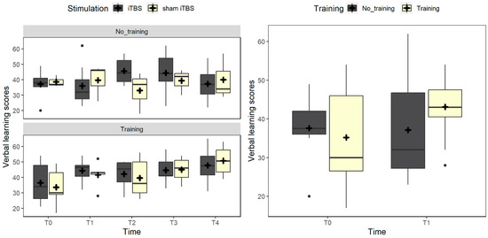 The figure depicts the verbal learning scores trend. On the left panel, the box plots compare real vs. sham iTBS in the no-training and training conditions. The right panel represents pre–post changes in the conditions of no training (gray box) vs. training (light yellow). Black dots represent outliers, and the cross symbol represents the mean values.