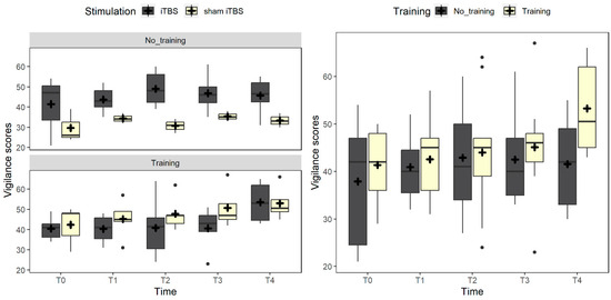 The figure represents the vigilance scores trend. On the left panel, the box plots compare real vs. sham iTBS in the no-training and training conditions. The right panel represents the trend at the different time points in the conditions of no training (gray box) vs. training (light yellow). Black dots represent outliers, and the cross symbol represents the mean values.