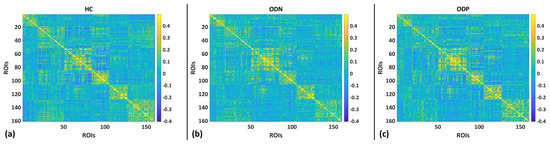 Brain functional connectivity for (a) healthy controls (HCs), (b) Parkinson’s with normal cognitive ability (ODN), and (c) Parkinson’s with severe hyposmia (ODP).