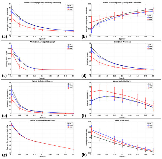 To compute the graph measures, we used functional connectivity matrices which were generated using Pearson’s correlation. The properties of the functional networks were considered as N × N (i.e., 160 × 160) by the undirected graph of a binary network, G(N,E), in which G denotes the non-zero subset. G consists of edges denoted by E that are coefficients obtained by intermodal correlation (i.e., Fisher’s Z values) and nodes (N—ROIs) as a number of operational links/connectivity amongst N number of nodes [19]. The proposed study employs an undirected binary network graph to compute the properties, enabling the comparison of nodal characteristics across participants and groups. A sparsity threshold was utilized to ensure that the same number of network edges were present for each participant, thereby retaining only the connections with edge strengths exceeding the predefined threshold [20]. A sparsity threshold (S) was used in the sparsity range from 0.1 (10%) to 0.5 (50%) sparsity thresholds (with a tolerance of 0.05) for the purpose of preventing excessive fragmentation of the network at sparser thresholds [18].