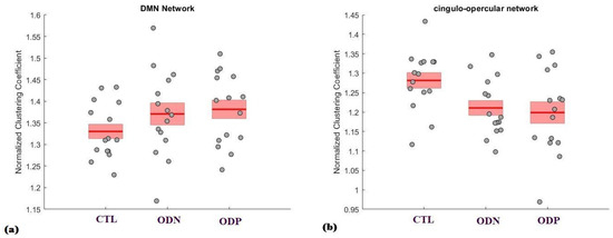 The figure presents a comparison of the normalized clustering coefficient across three groups, healthy controls (CTL), Parkinson’s patients with normal cognitive ability (ODN), and Parkinson’s patients with severe hyposmia (ODP), within two specific brain networks: (a) Default Mode Network (DMN) and (b) cingulo-opercular network.
